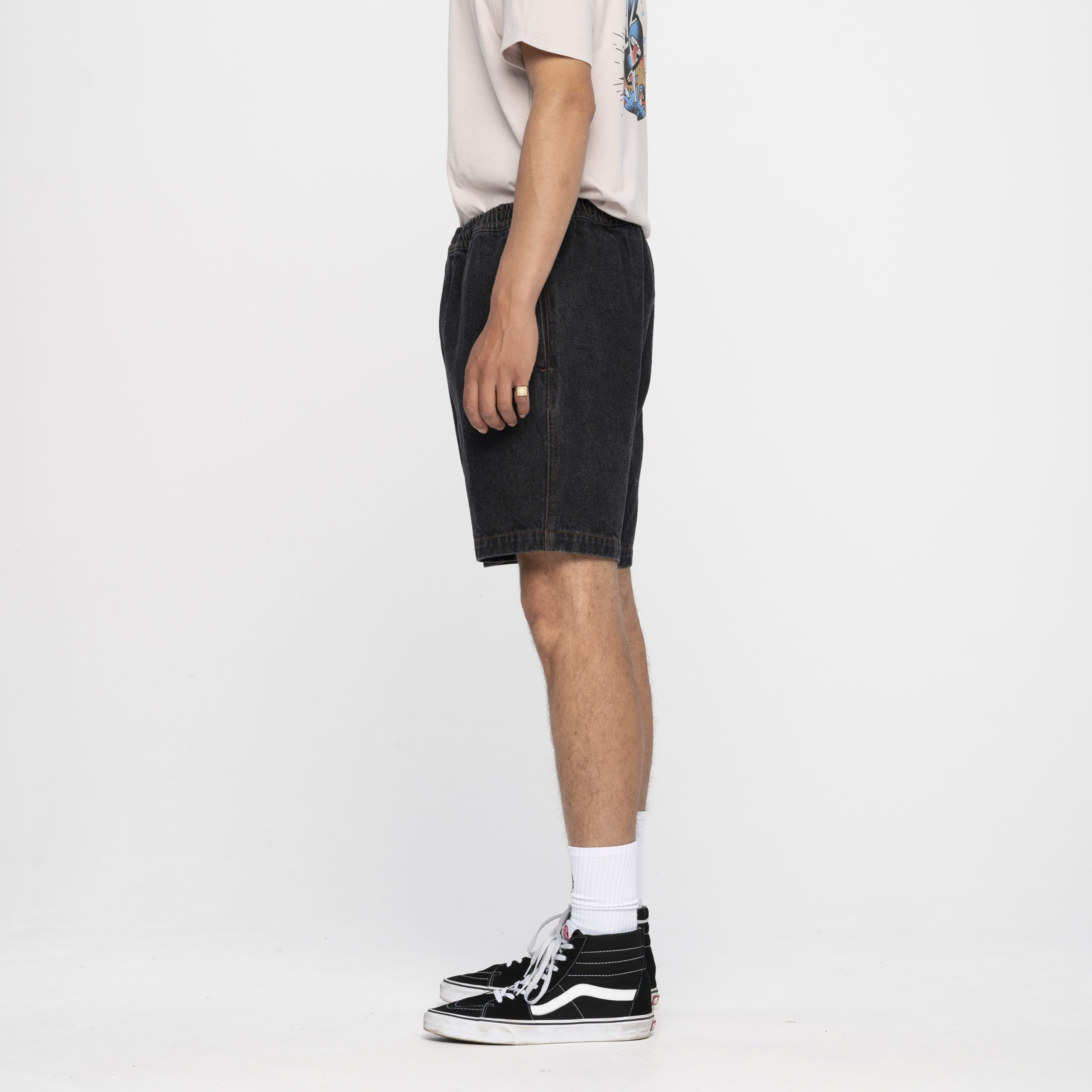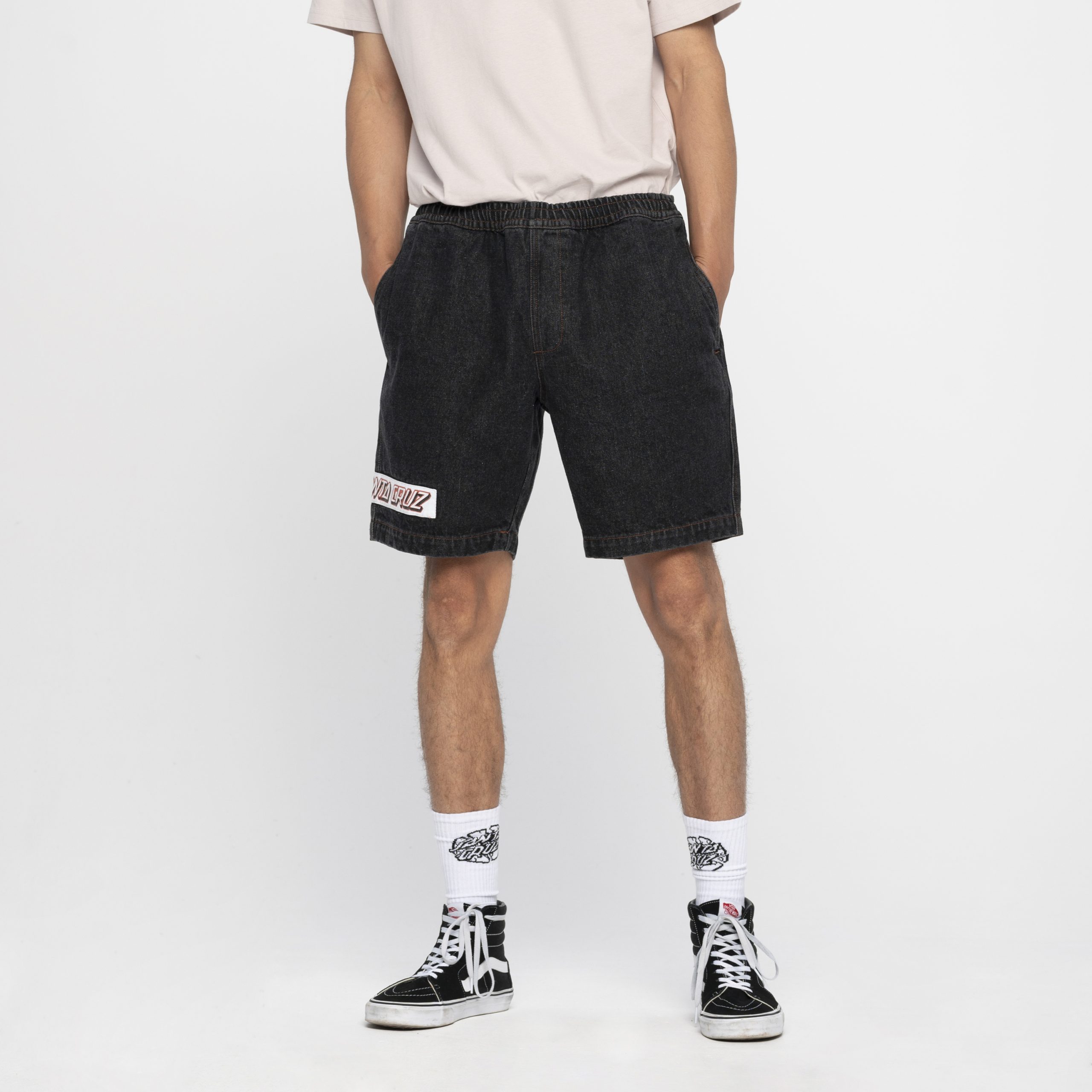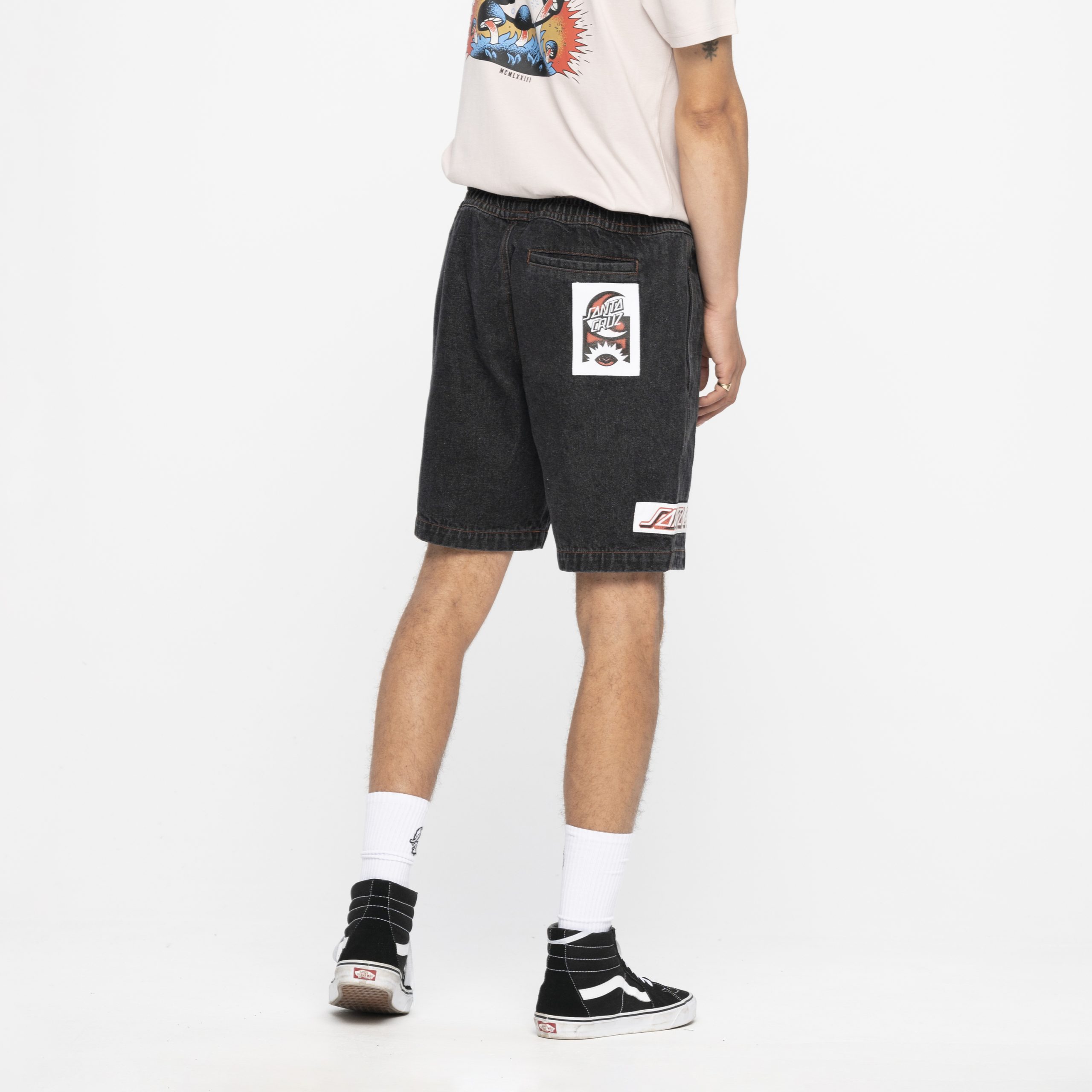 100% cotton, 13.5oz denim, beach short with elasticated waist, side and back pockets and printed applique patches