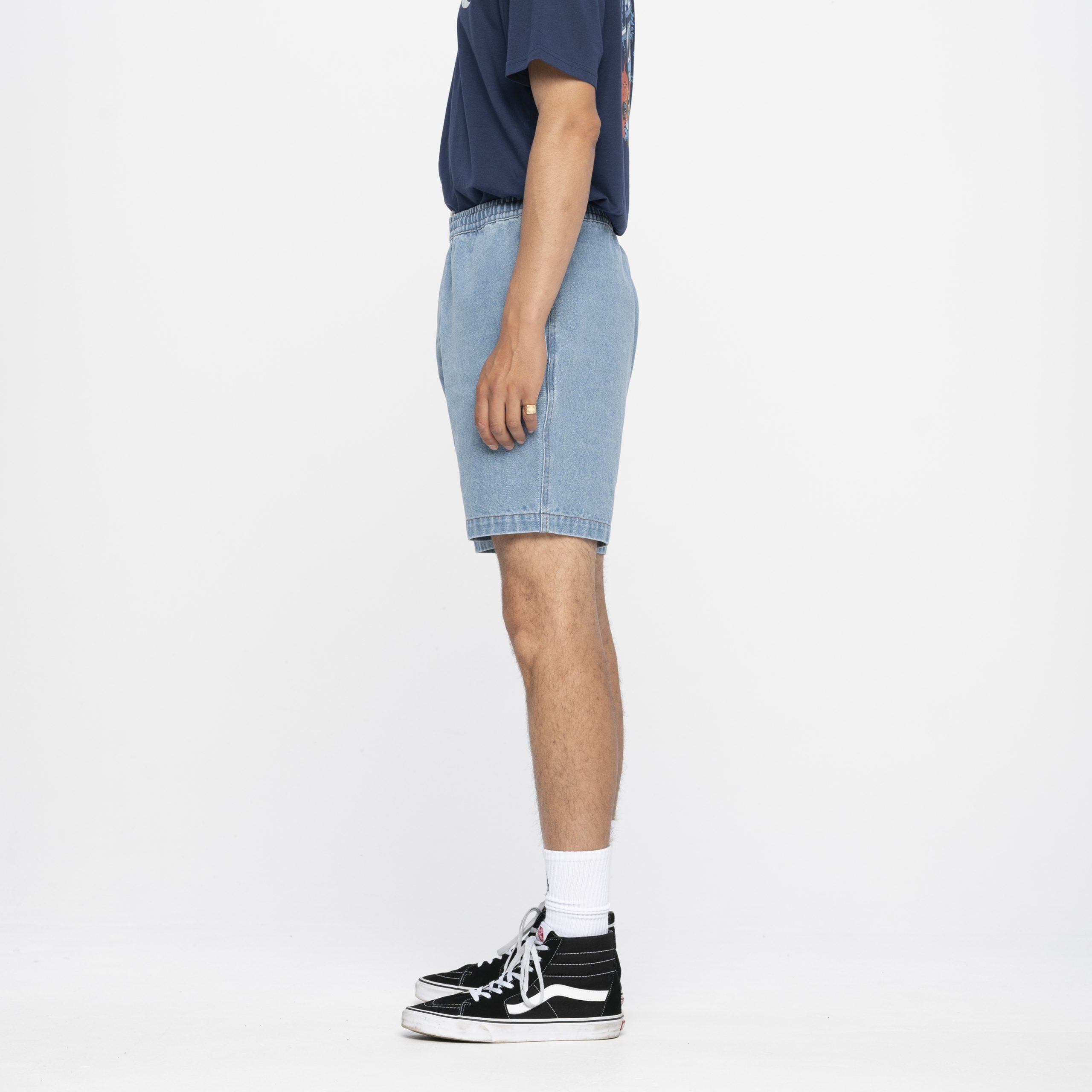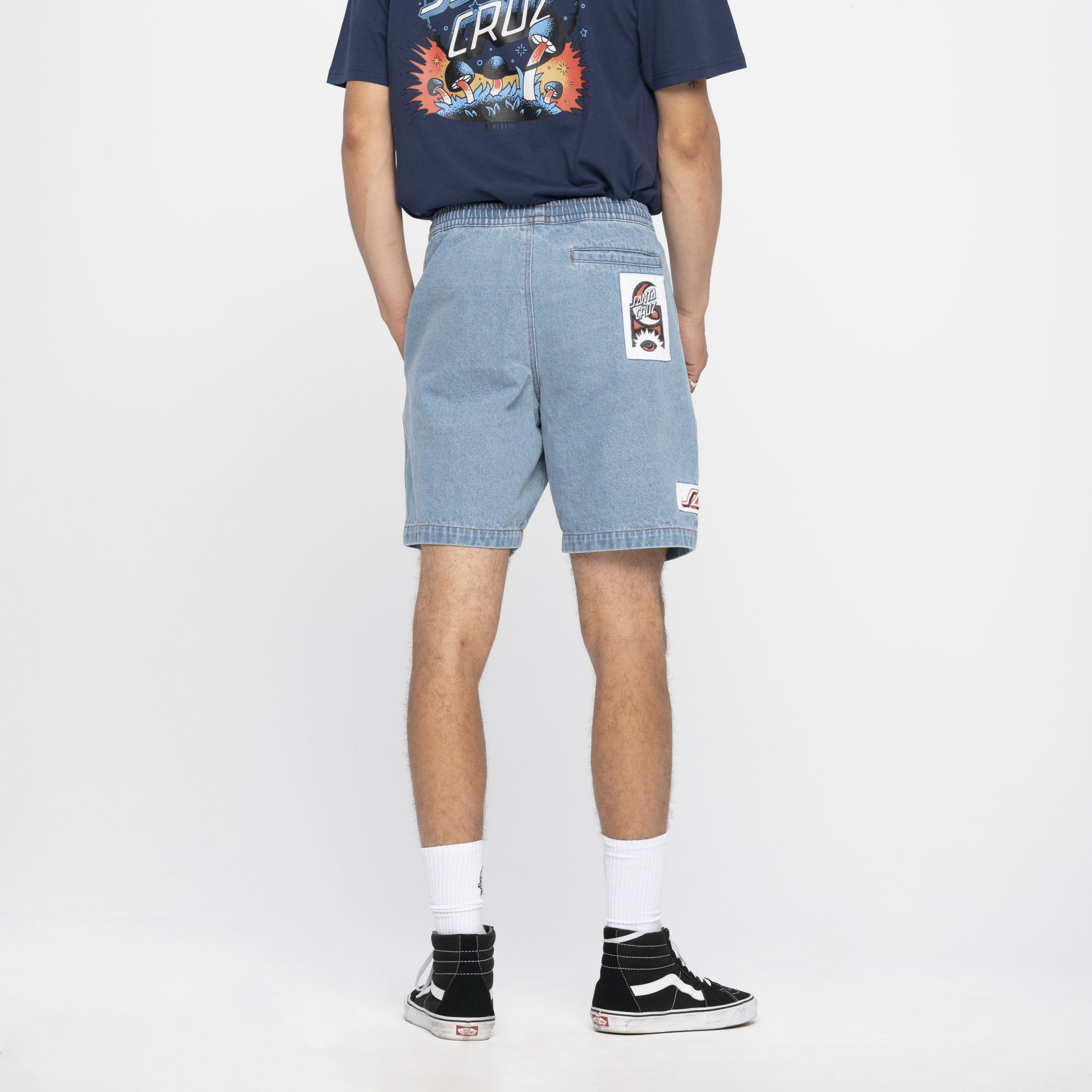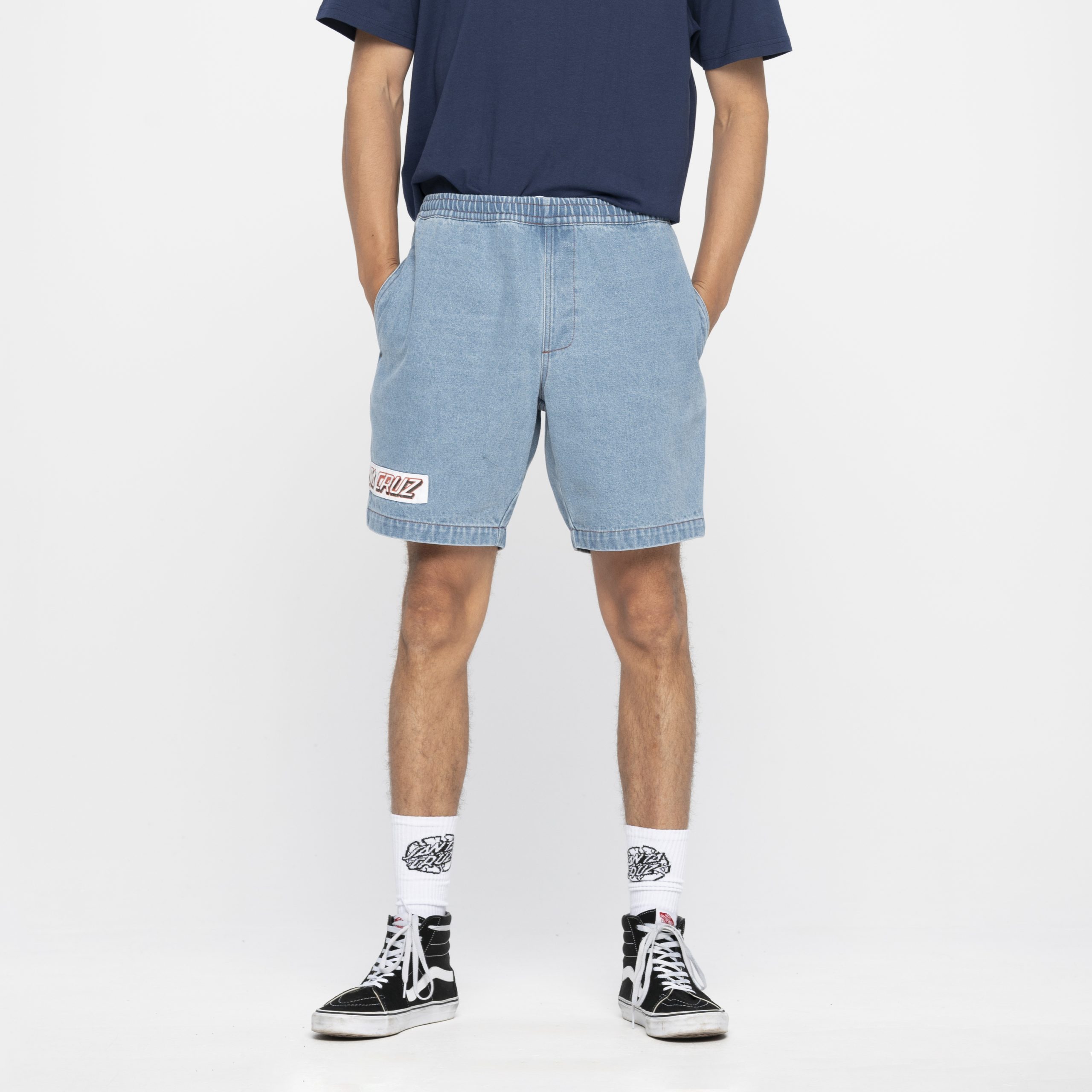100% cotton, 13.5oz denim, beach short with elasticated waist, side and back pockets and printed applique patches